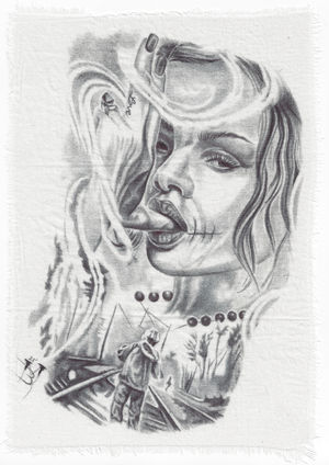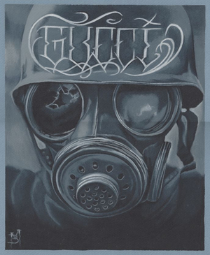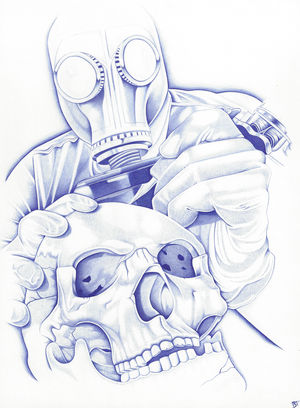 | Gasmask Head Tatooing Skull - Blue Ink - 8.25 x 11.25 - White Heavyweight Paper - 2013 (Sold) | ||