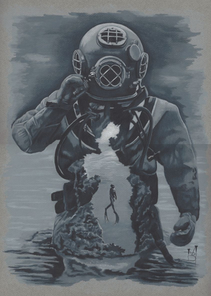 | Hard Hat Diver - No Title - Blue And Black Ink - 11.0 x 14.75 - Colored Art Paper - 2021 | ||