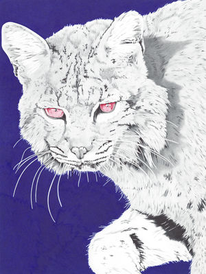 | Bobcat With Red Eyes - Black And Blue And Red Ink - 8.25 x 11 - White Cardstock Paper - 2014 (Sold) | ||
