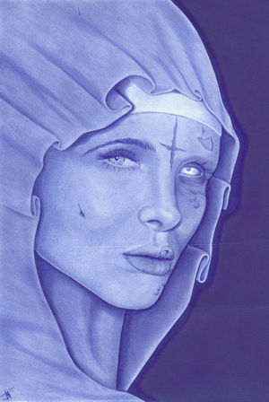 | Title: Evil Nun - Blue Ink - 6.0 x 9.0 - White Cardstock Paper (Has Creases) - 2015 (Sold) | ||