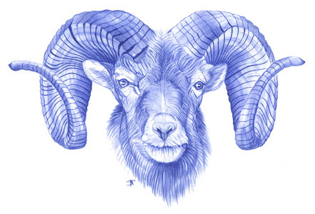 | Title: Big Horn Ram - Blue Ink - 8.75 x 6.0 - White Heavyweight Paper - 2015 (Sold) | ||