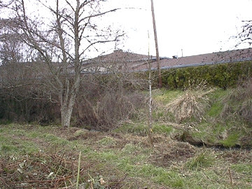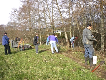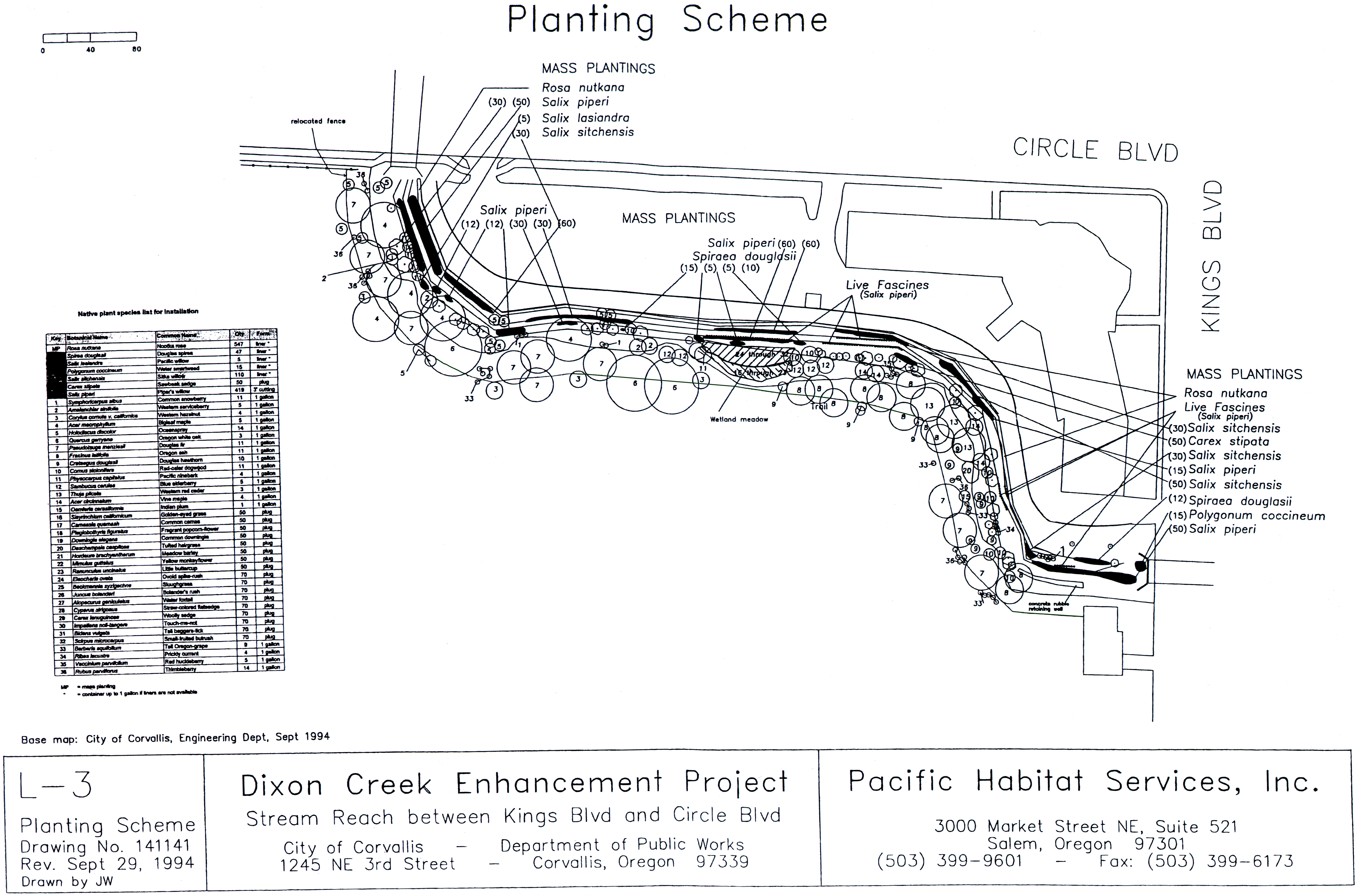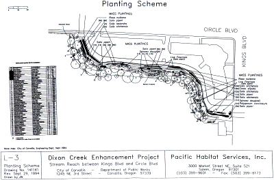 One of the main goals of the project was to remove invasive exotic plants and replace them with native riparian vegetation. One of the first tasks required for this effort was the mapping of existing trees, shrubs, and herbs. All of the trees along the Jefferson Elementary side of Dixon Creek were identified and mapped (see Tree identification and mapping) and a general census of shrub and herb plant cover was conducted by community volunteers. It was determined that the vast majority of existing trees were already native species. For the shrub and herb plant cover, however, there was a significant amount of the invasive exotic Himalayan blackberry and some reed canarygrass present.