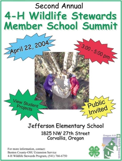 This community event was an opportunity for youth from 10 Benton and Linn County 4-H Wildlife Stewards Member schools to come together in one location to showcase their schoolyard projects.During the day visiting students presented their educational posters to a team of judges, rotated through hands on natural resource learning centers, took a student led tour of the Dixon Creek Restoration project and listened to keynote speaker, Chris Maser, local author and research scientist.